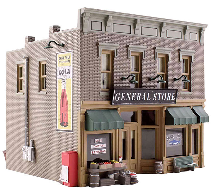 Every layout needs a general store - the social hub of early-day, rural America. Lubener's General Store is where town residents can play checkers and chat, while others shop for groceries, household items and sundries. Building details include awnings, bubblegum dispensers, signs, curtains, light fixtures and lit interiors with a printed background scene. See photos for footprint.